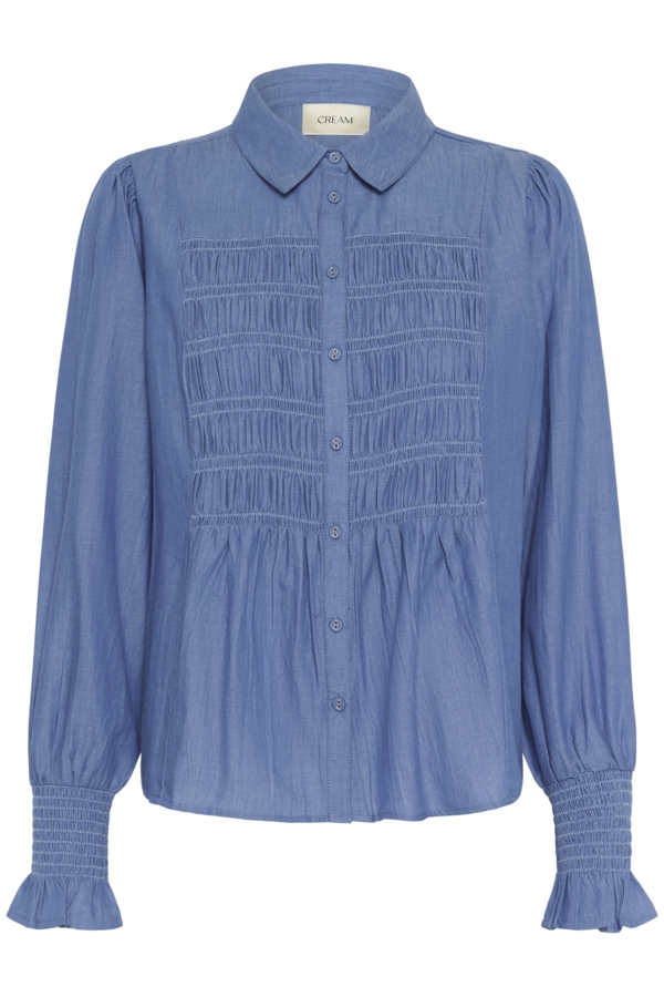 Klassisk skjorte krave, smock over brystet, samt smock og flæse ved håndled.