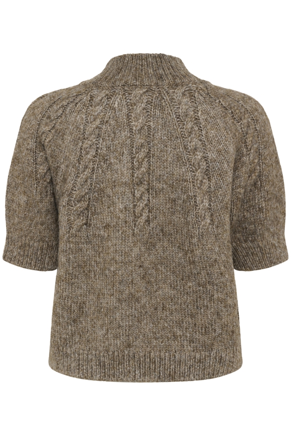 Skøn Kaffe Cuba strik i fed ny brun melange. Lille turtleneck, snoninger foran og korte ærmer.