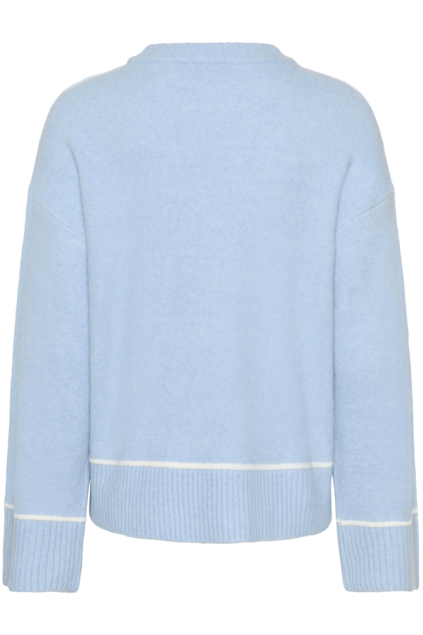Super lækker og blød Kaffe Jinie strik i lyseblå med hvid kontrast. Dejlig strik med rund hals og lange ærmer, løs og rummelig.