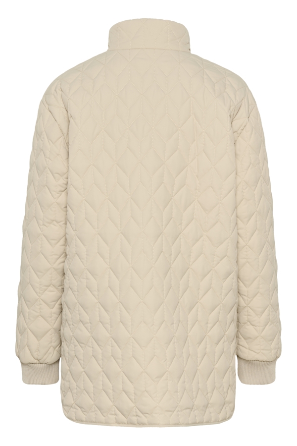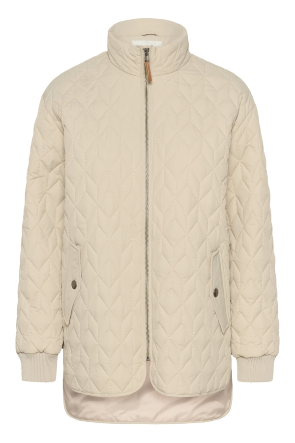 Skøn Leila Kaffe jakke, der er quiltet. Dejlig anvendelig jakke i lys beige, med høj krave og rib ved håndled.