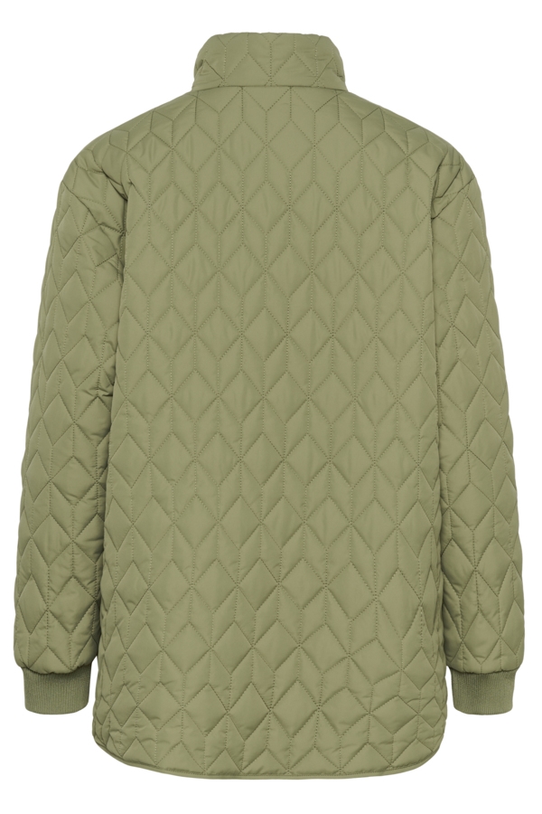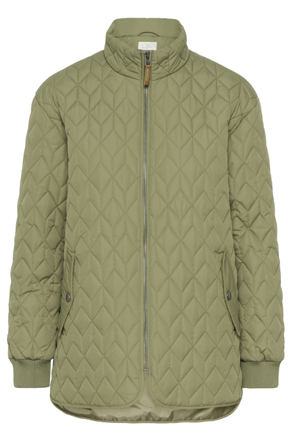 Skøn Leila Kaffe jakke, der er quiltet. Dejlig anvendelig jakke i lækker grøn, med høj krave og rib ved håndled.