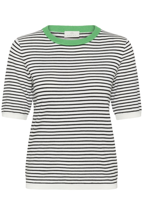 Fed Kaffe Lizza strik med korte ærmer. Hvid med smalle sorte striber og grøn kontrast.
