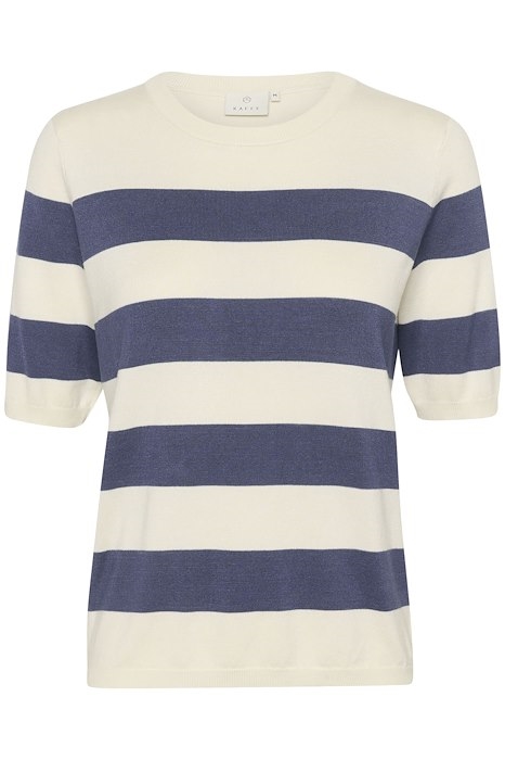 Super sød Kaffe Lizza stribet strik med korte ærmer og rund hals. Hvid med brede indigoblå striber, perfekt til et par jeans. Blød og lækker strik.