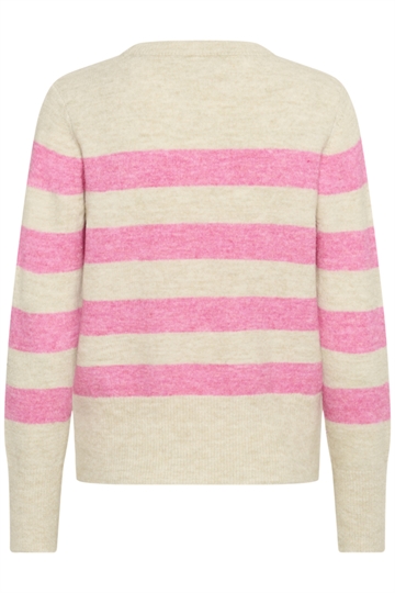 Lækker blød Kaffe Niel stribet strik. Rund hals, lange ærmer, sandfarvet og pink brede striber. Blød og dejlig.