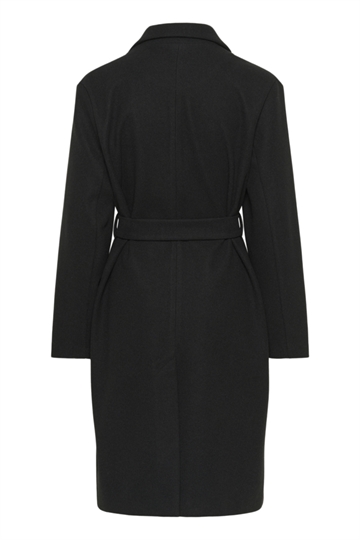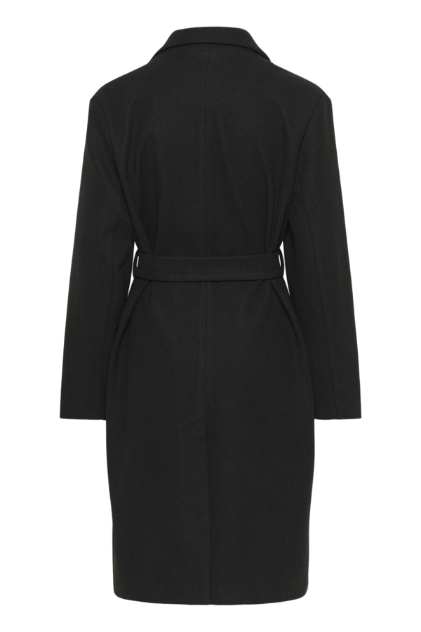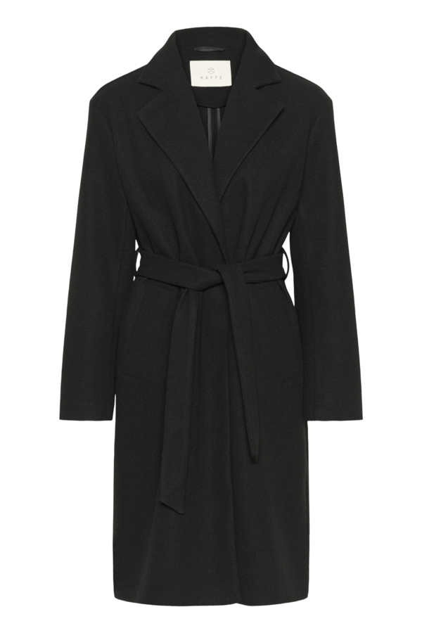 Smuk sort Kaffe Saturn frakke med klassisk revers, bindebælte og lige silhuet. Diskret, minimalistisk design med fuld længde ærmer og struktureret finish. Cool og klassisk.