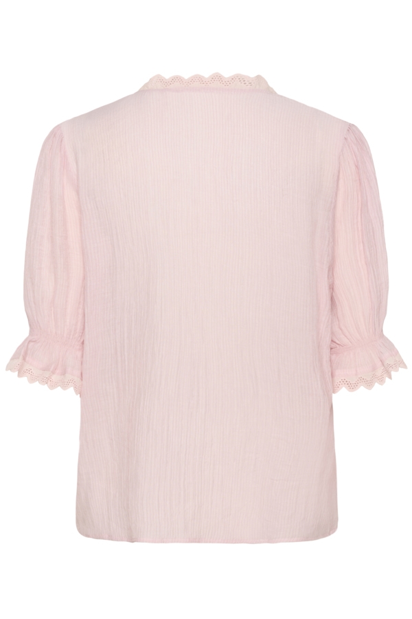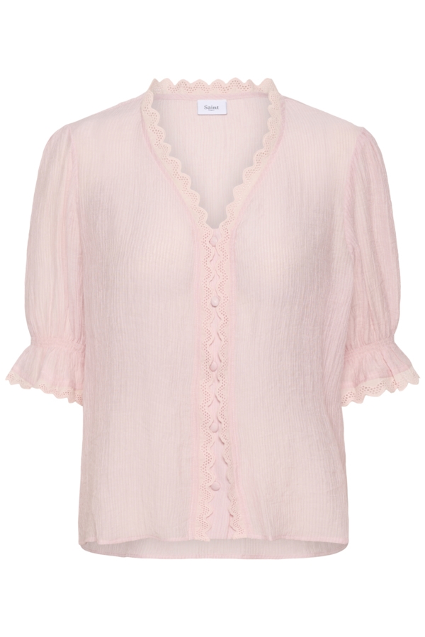 Skøn Saint Tropez Kristel bluse i sart rosa. Bluse med afslappet pasform, feminin flæsekant ved halsudskæring og detalje foran. Korte ærmer med flæsemanchetter. Komfortabel og alsidig til hverdag og fest. Let kreppet.