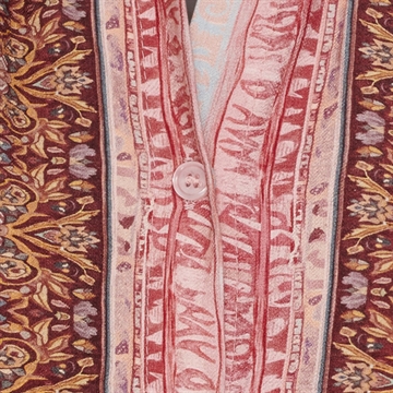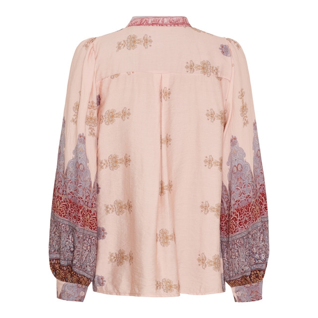 Mønster mix i rosa og lilla toner. Gennemknappet bluse med rynk ve skulder og lidt store ærmer.