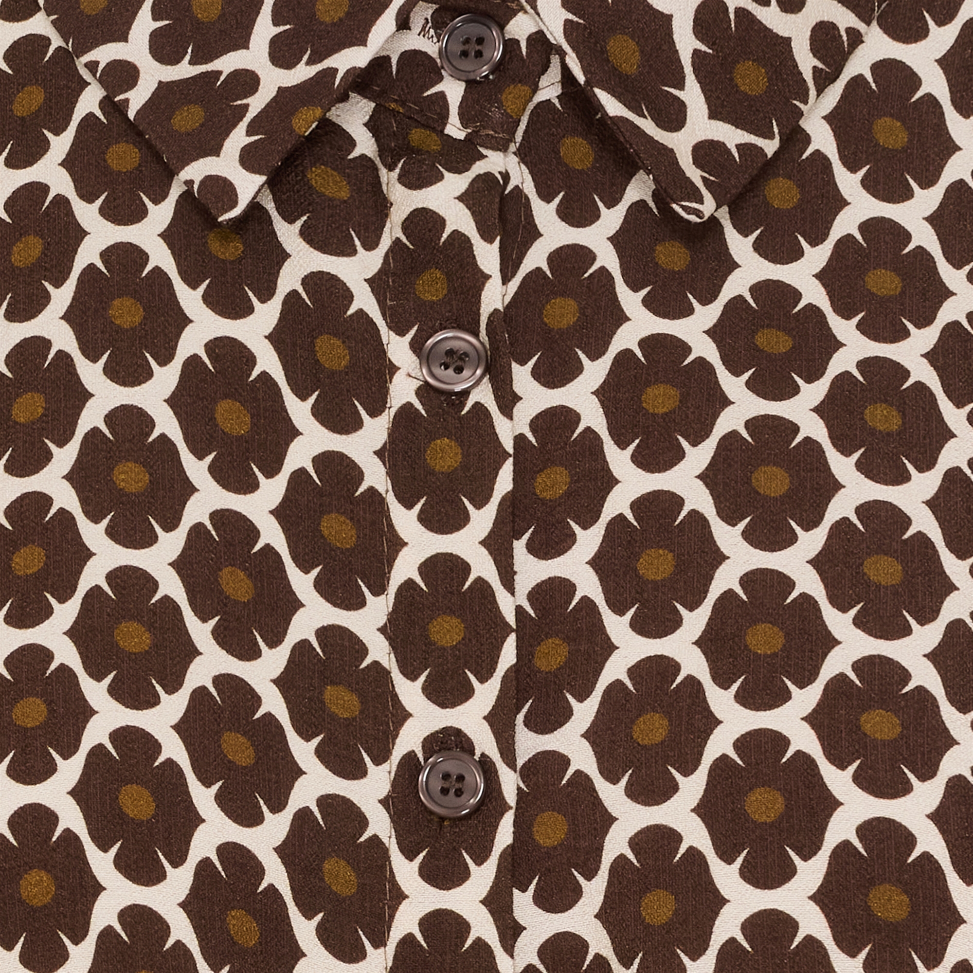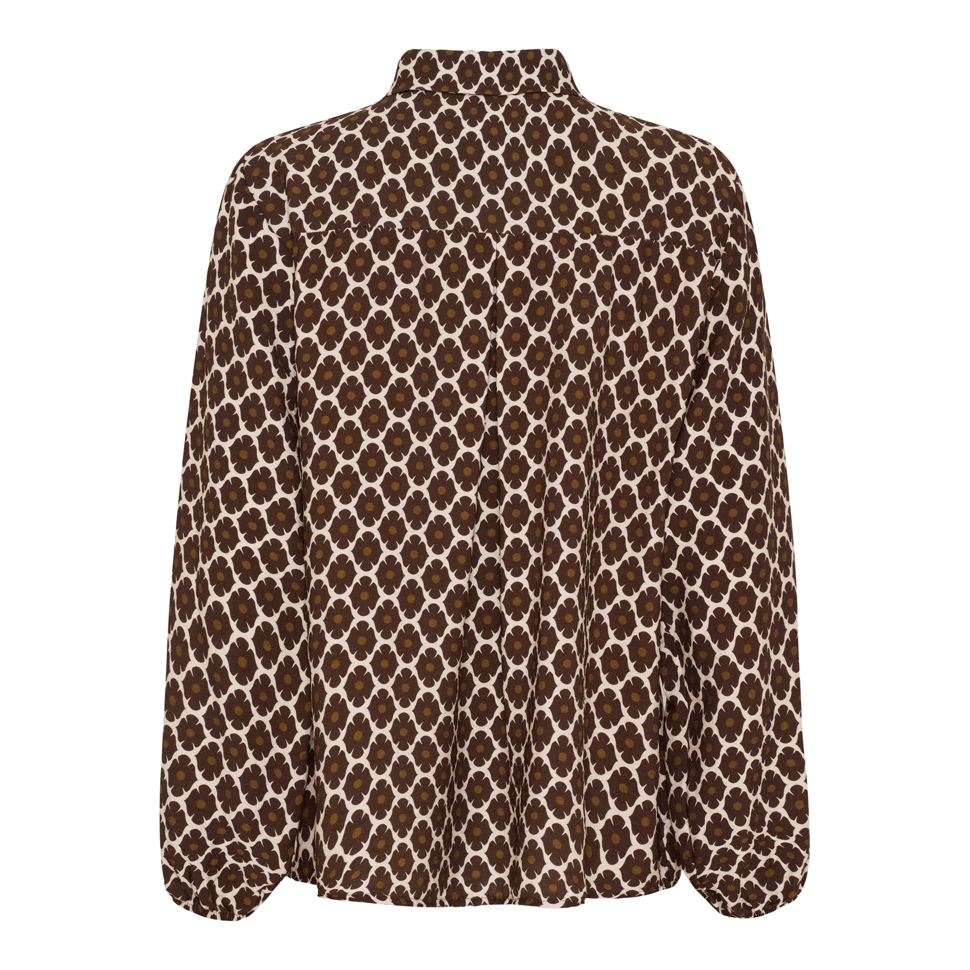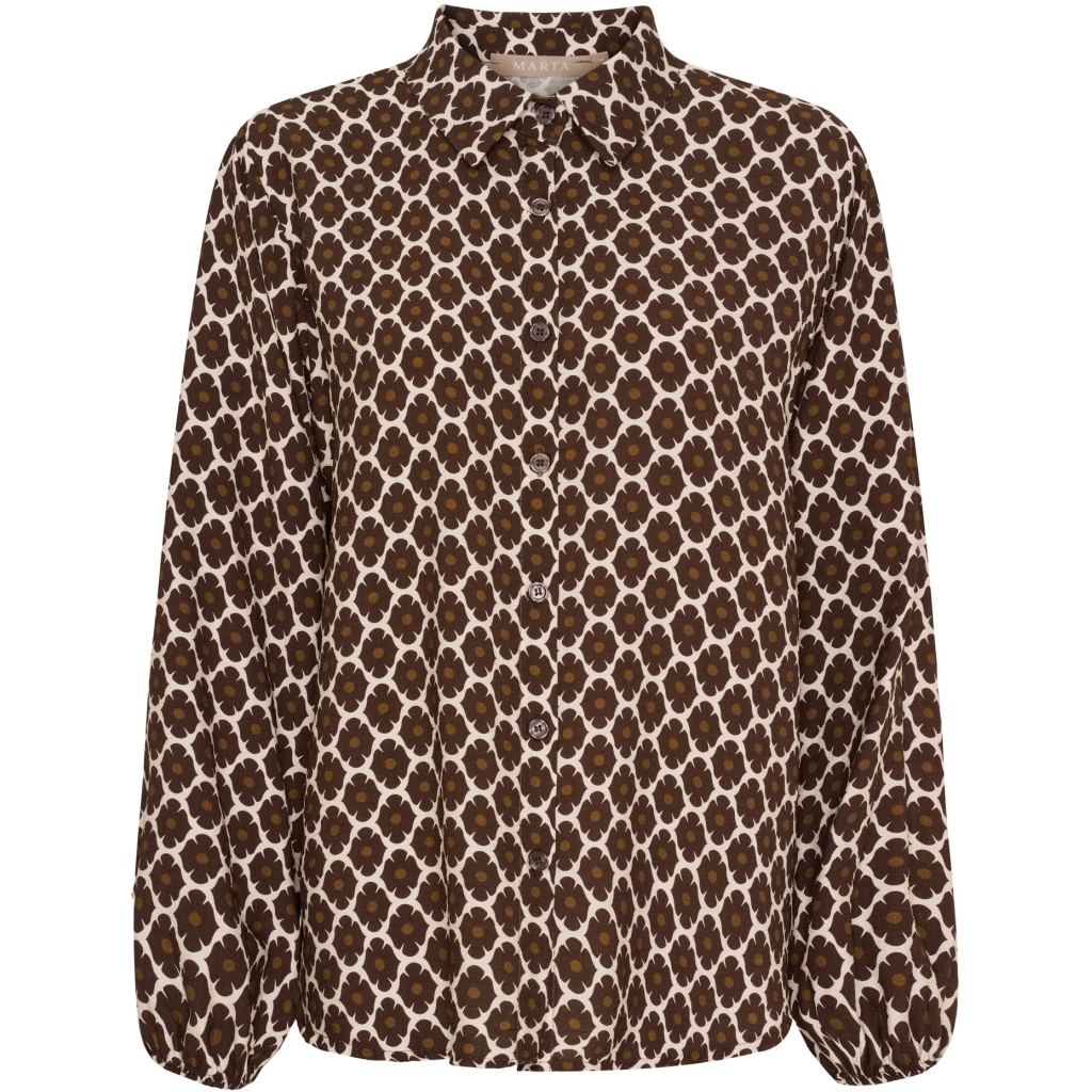 Skøn Marta Anatares bluse med brunt mønster. En fed bluse med retro mønster, lange ærmer og gennemknappet.