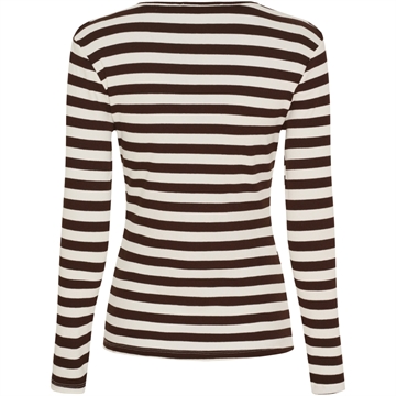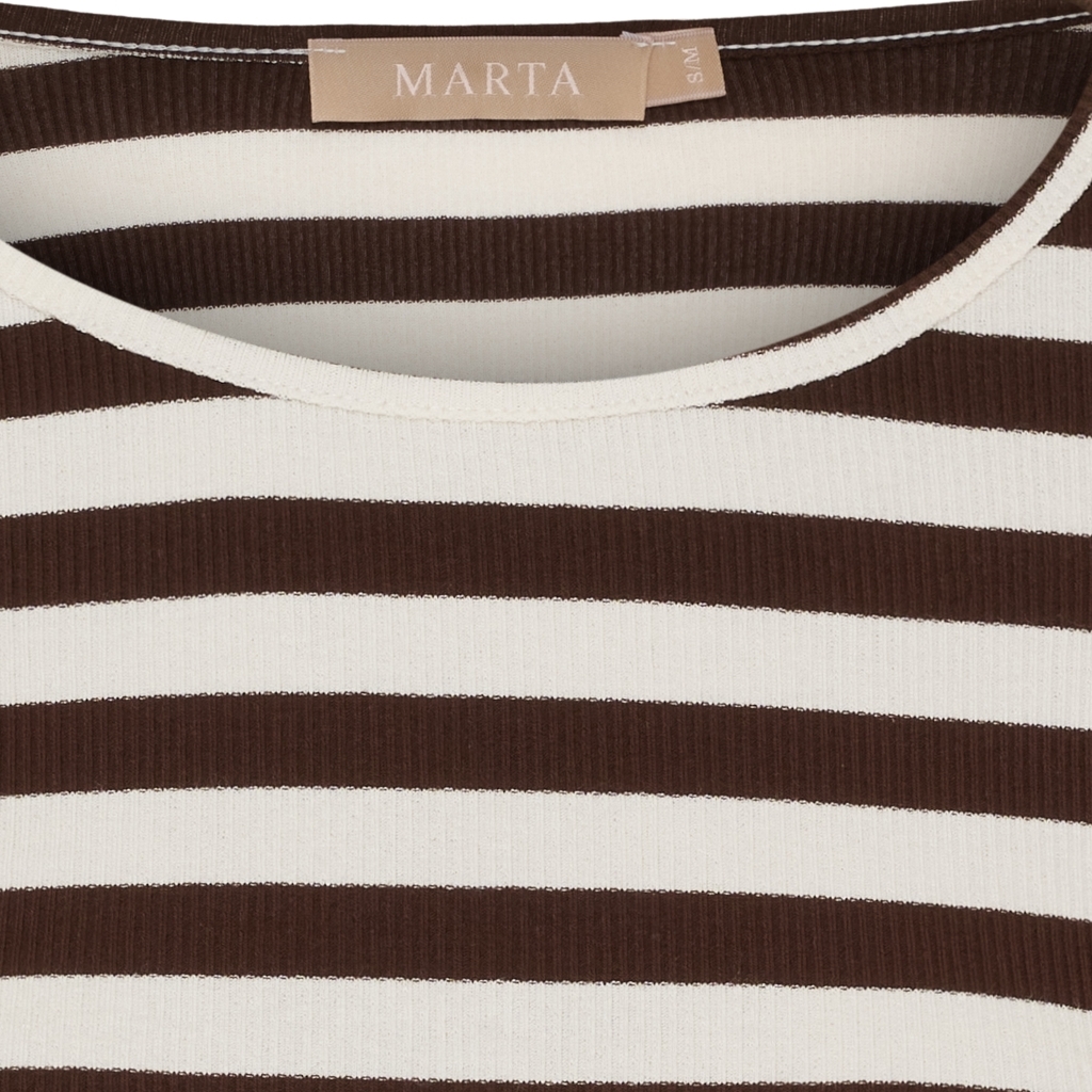 Super lækker Marta Begonia t shirt. Rib t shirt, med mørkebrune og hvide striber, rund hals og lange ærmer.