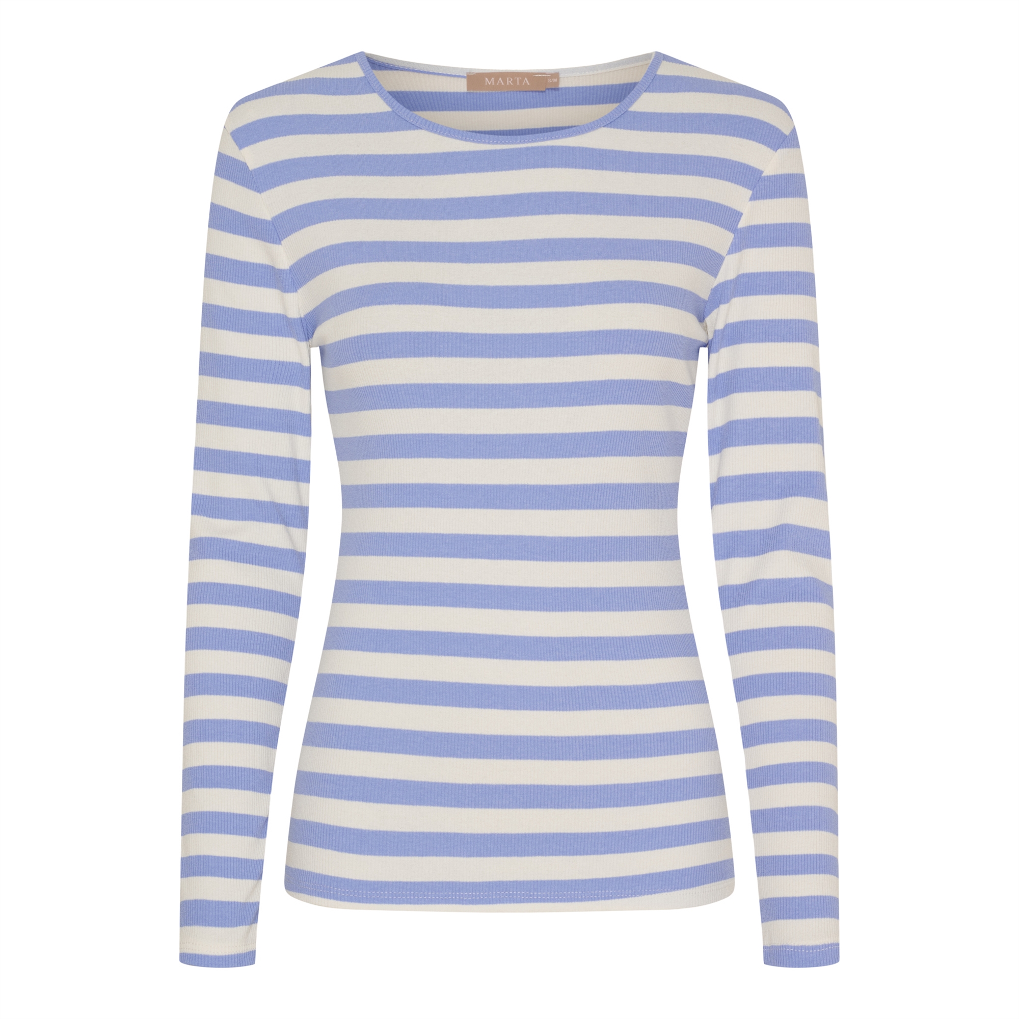 Super lækker Marta Begonia t shirt. Rib t shirt, med lyseblå og hvide striber, rund hals og lange ærmer.