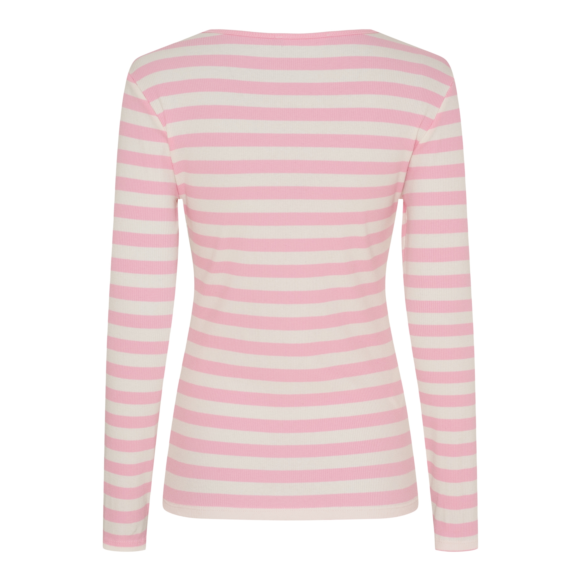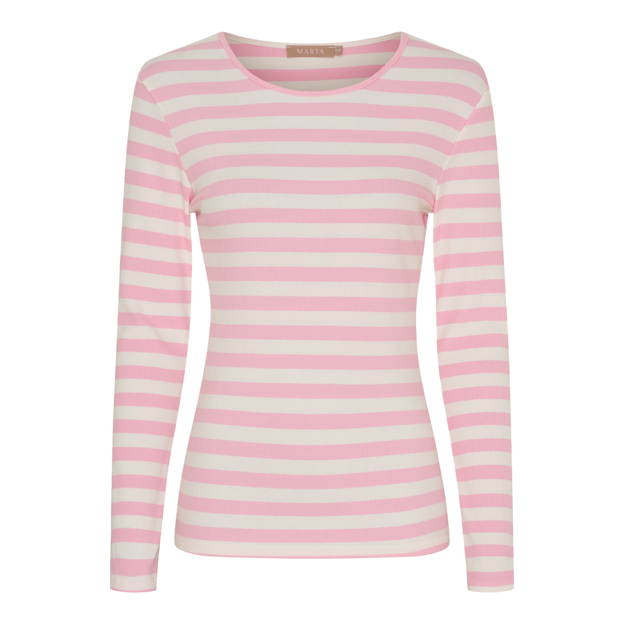 Super lækker Marta Begonia t shirt. Rib t shirt, med lyserøde og hvide striber, rund hals og lange ærmer.