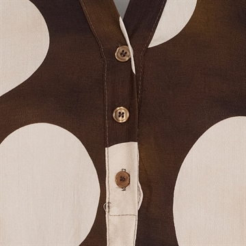 Brun kjole med hvide store bomber, 3/4 ærmer der afsluttes med elastik og flæse, lille stolpelukning.