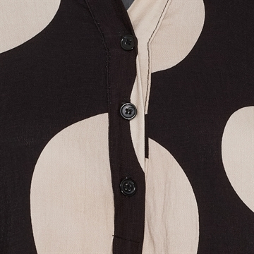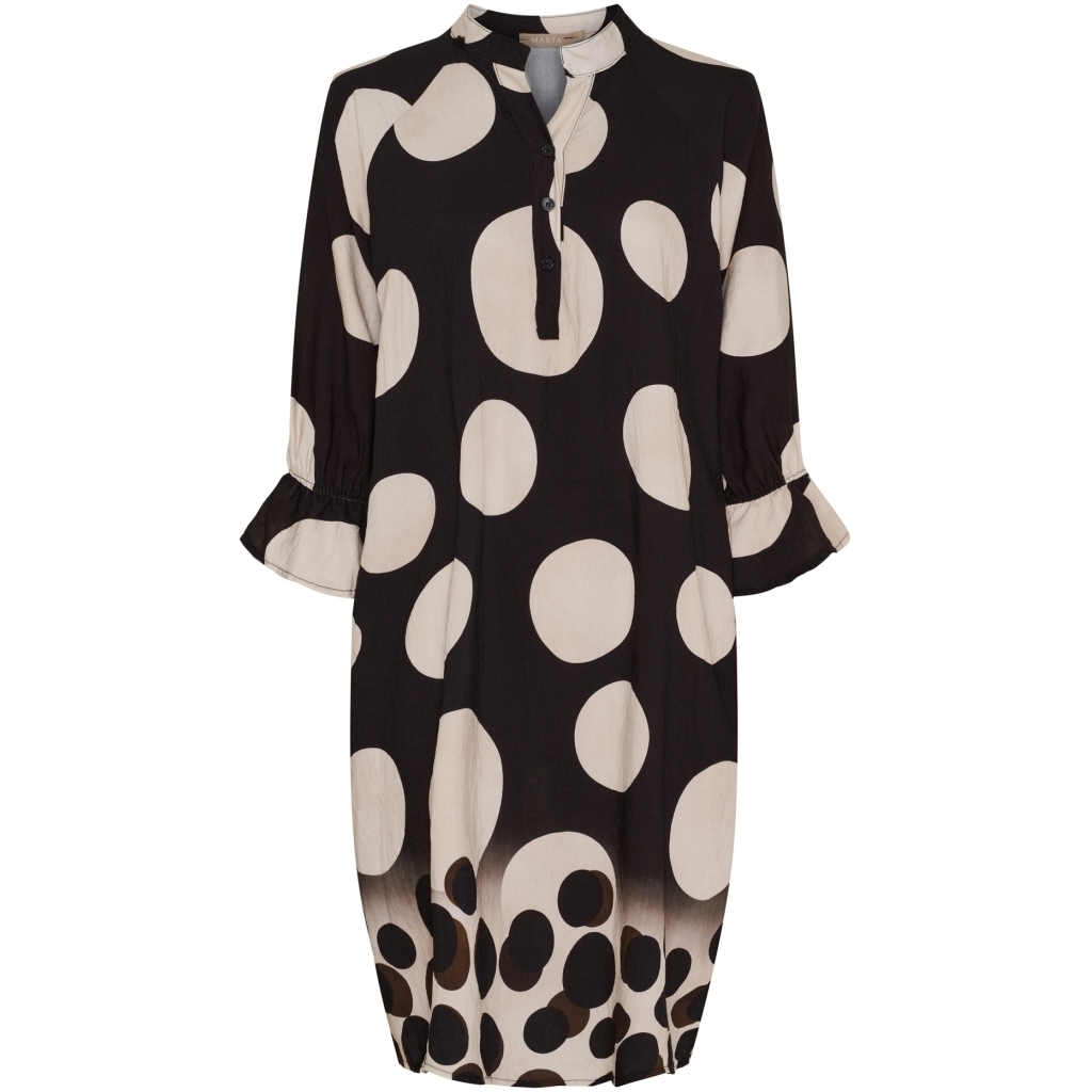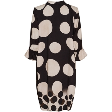 Sort kjole med hvide store bomber, 3/4 ærmer der afsluttes med elastik og flæse, lille stolpelukning.