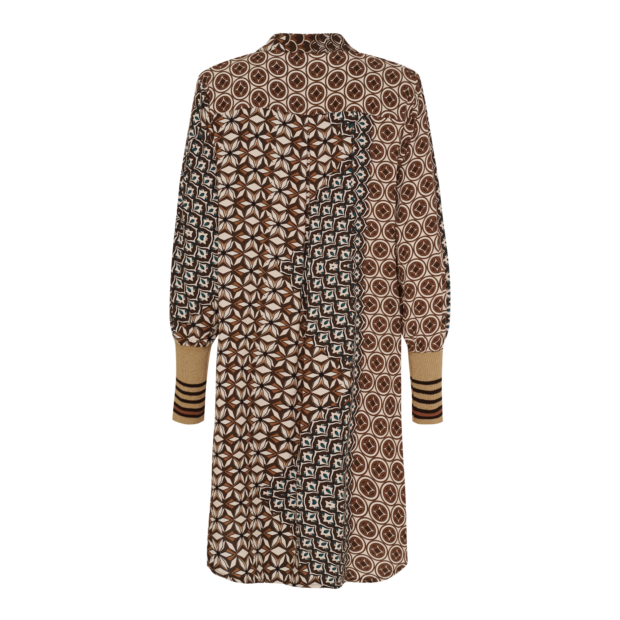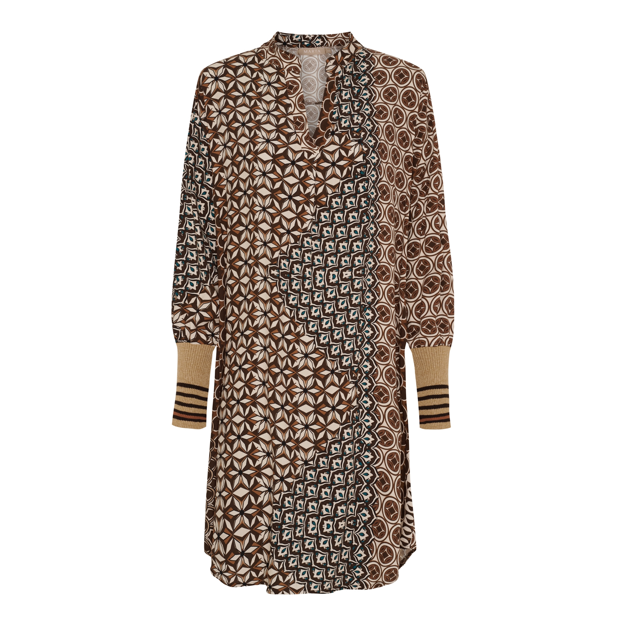 Skøn Marta Dominika kjole i smukt brun, beige og blåt mønster.