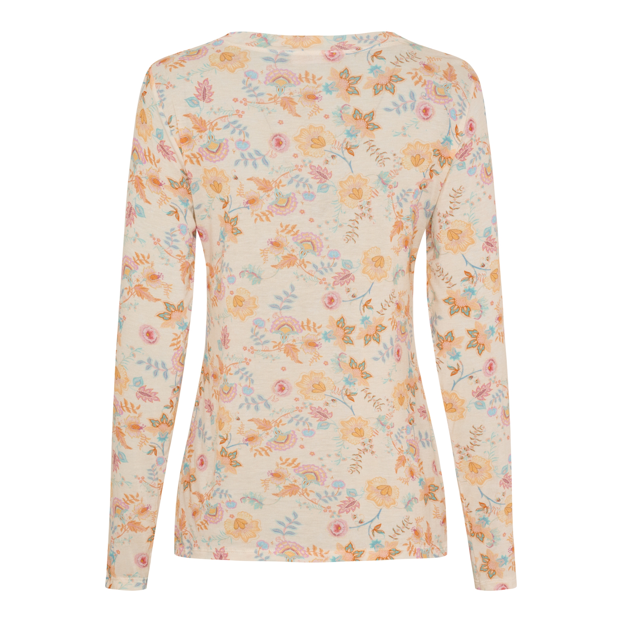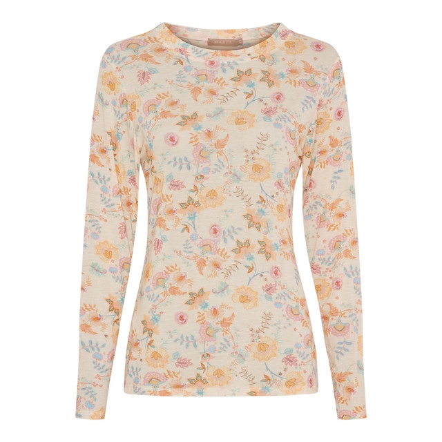 En fantastisk Marta Du Chateau Elissa t shirt, i lækker tynd kvalitet i beige med blomster. Rund hals og lange ærmer. Denne t shirt er tænkt som den "nye mesh", brug den under strik, bluser, kjoler mm