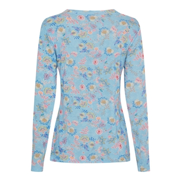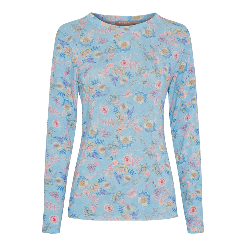 En fantastisk Marta Du Chateau Elissa t shirt, i lækker tynd kvalitet i lyseblå med blomster. Rund hals og lange ærmer. Denne t shirt er tænkt som den "nye mesh", brug den under strik, bluser, kjoler mm