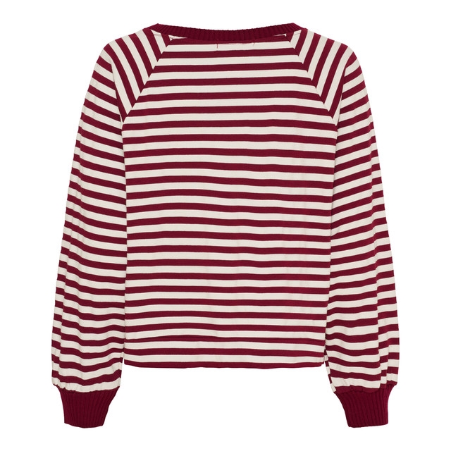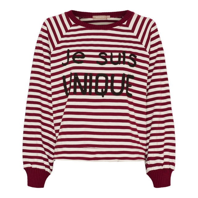 Marta Du Chateau Fenja sweat med bordeaux striber og brun skrift.
