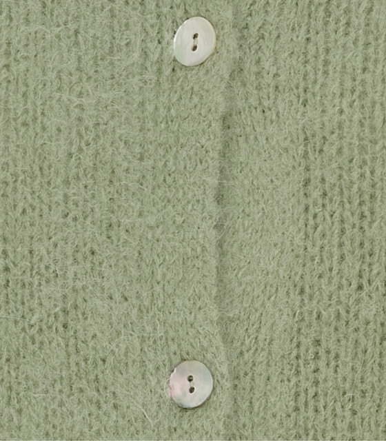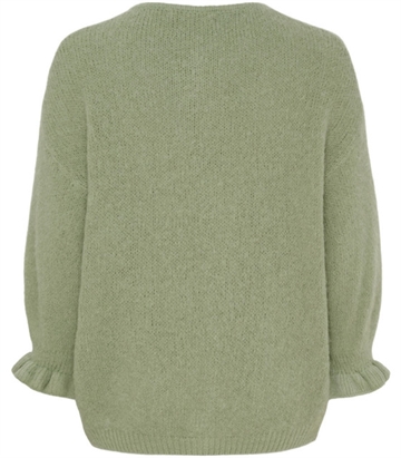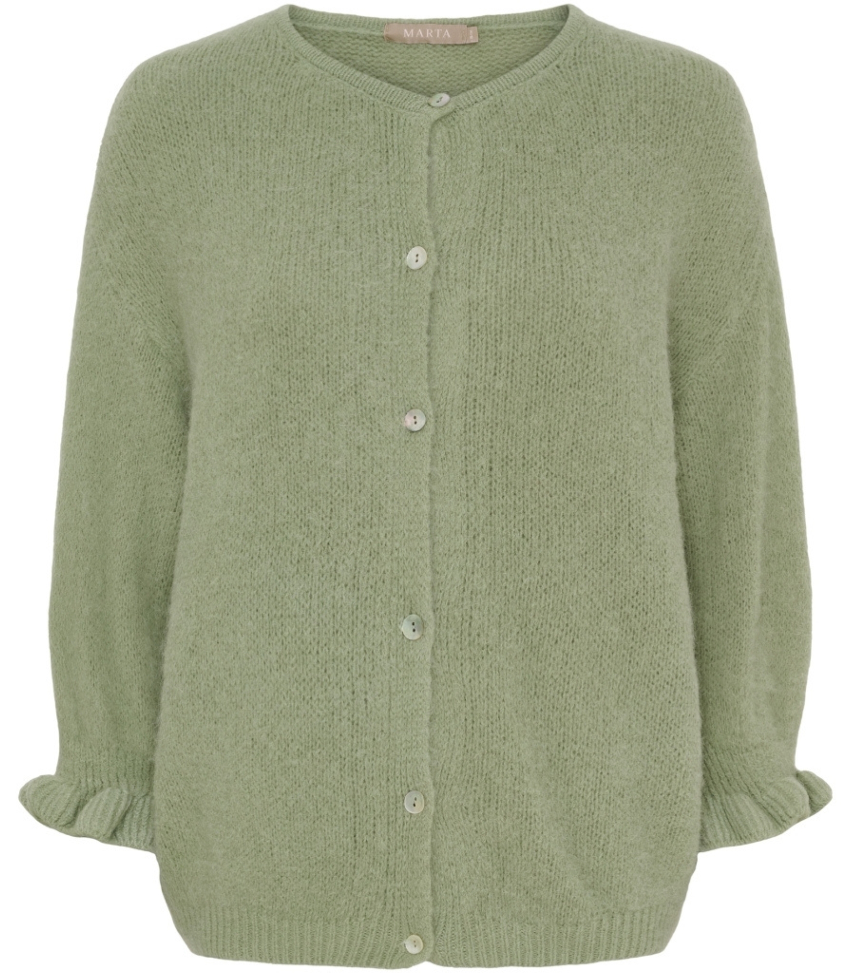 Lækker Marta Juliana cardigan i skøn grøn farve, med 3/4 ærmer der afsluttes med lille flæse.
