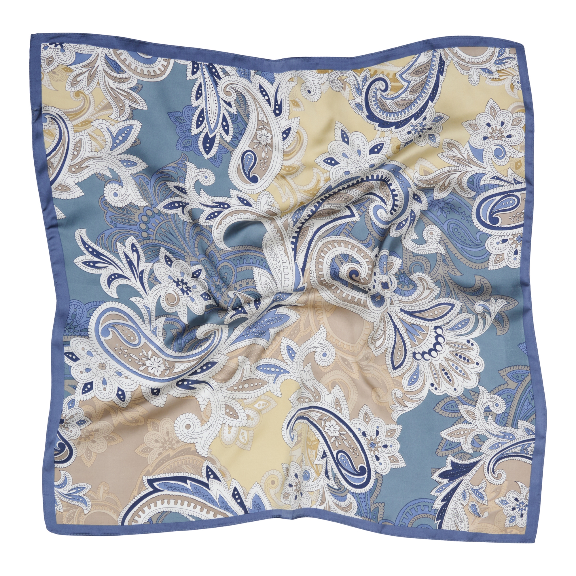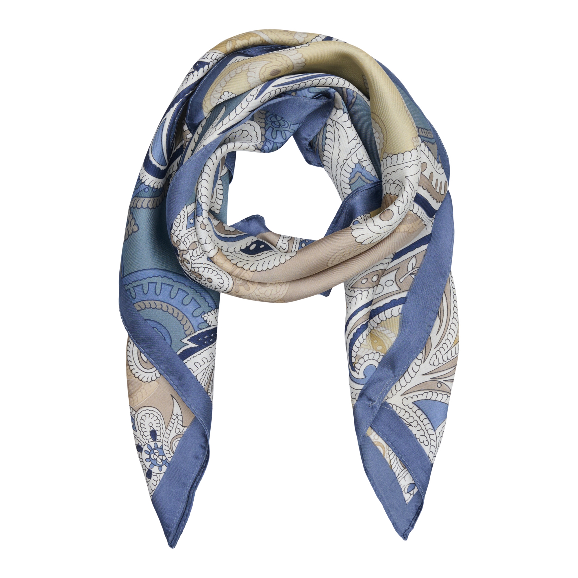 Super fint lille Marta Du Chateau Juline tørklæde i blå og beige, let og lækkert. Nemt at sætte.