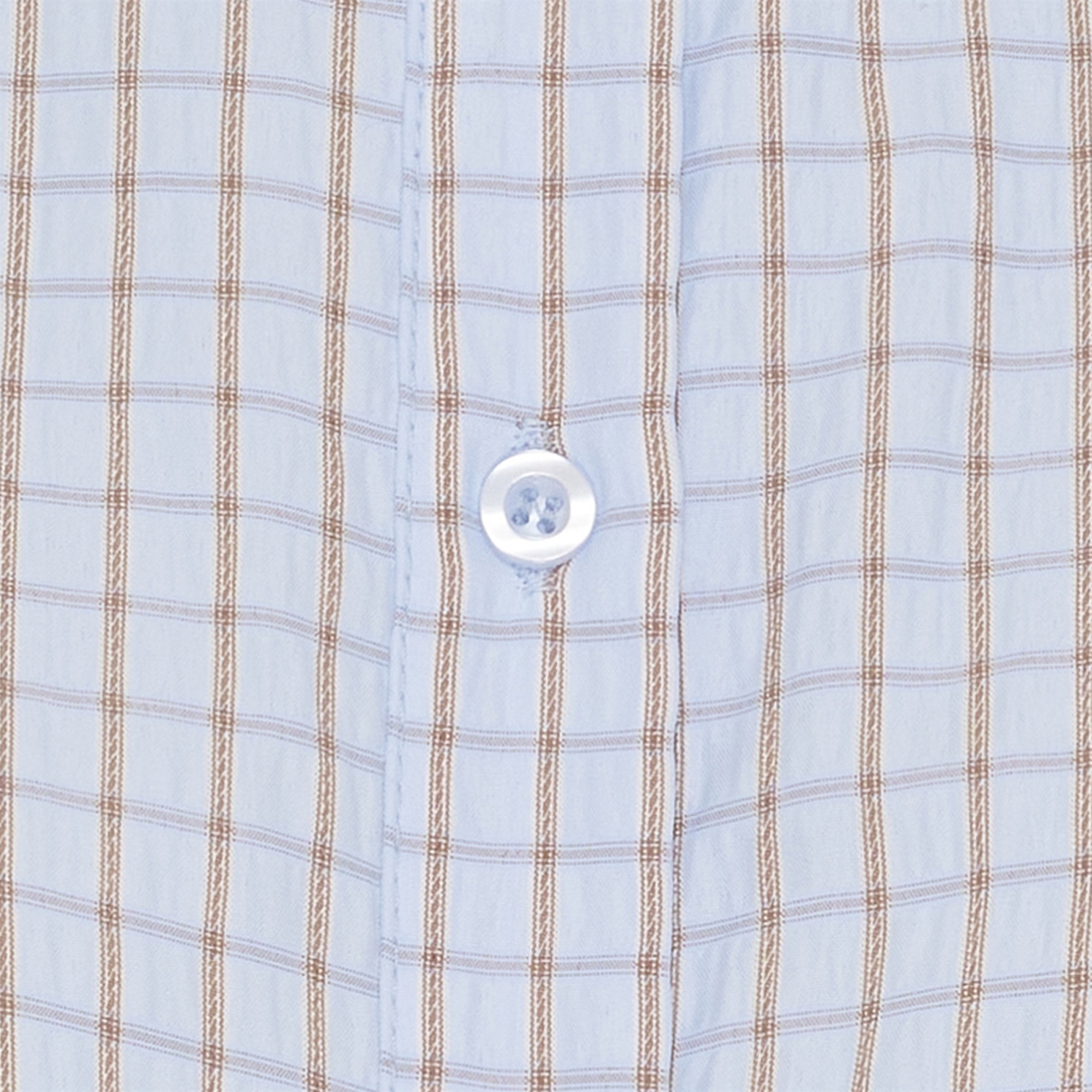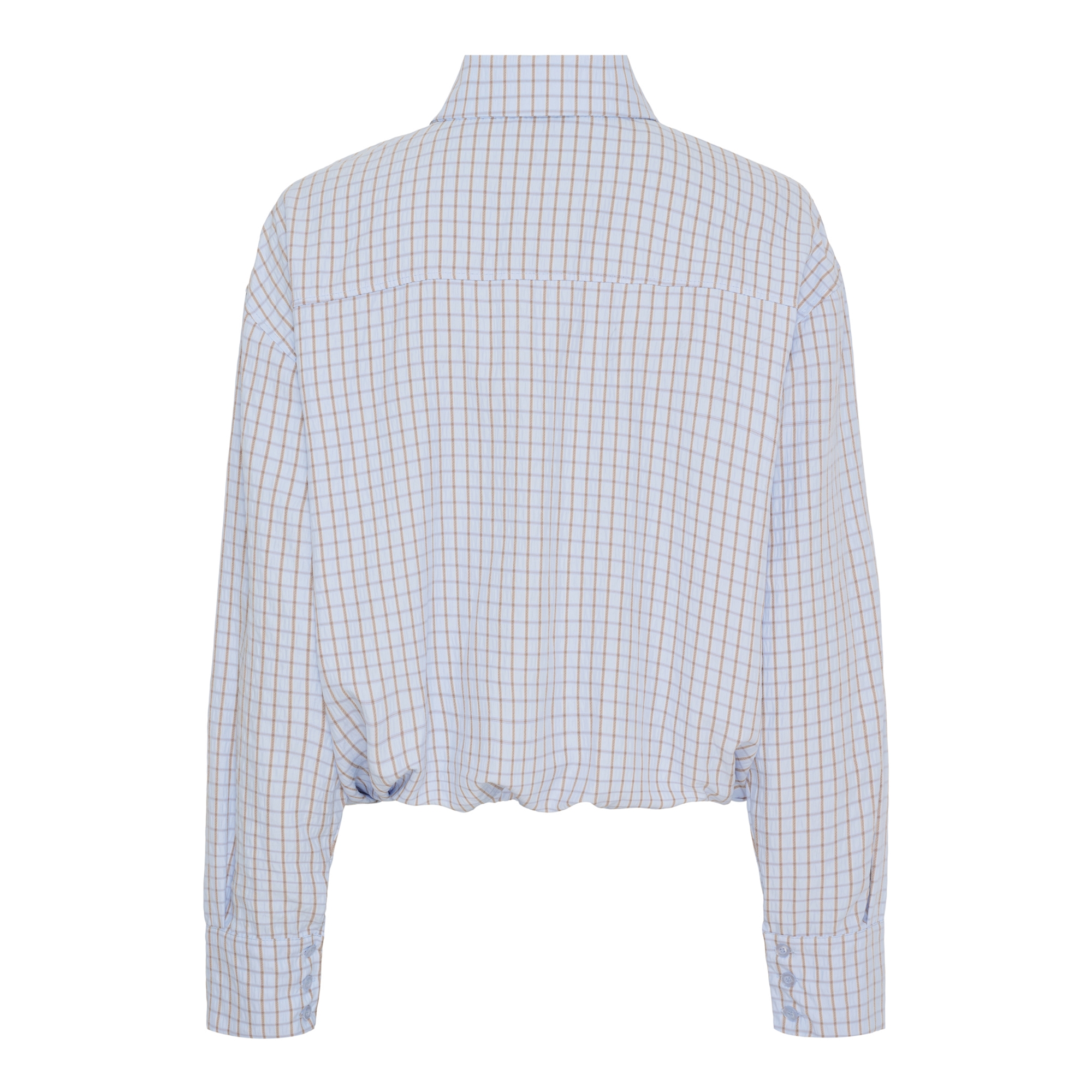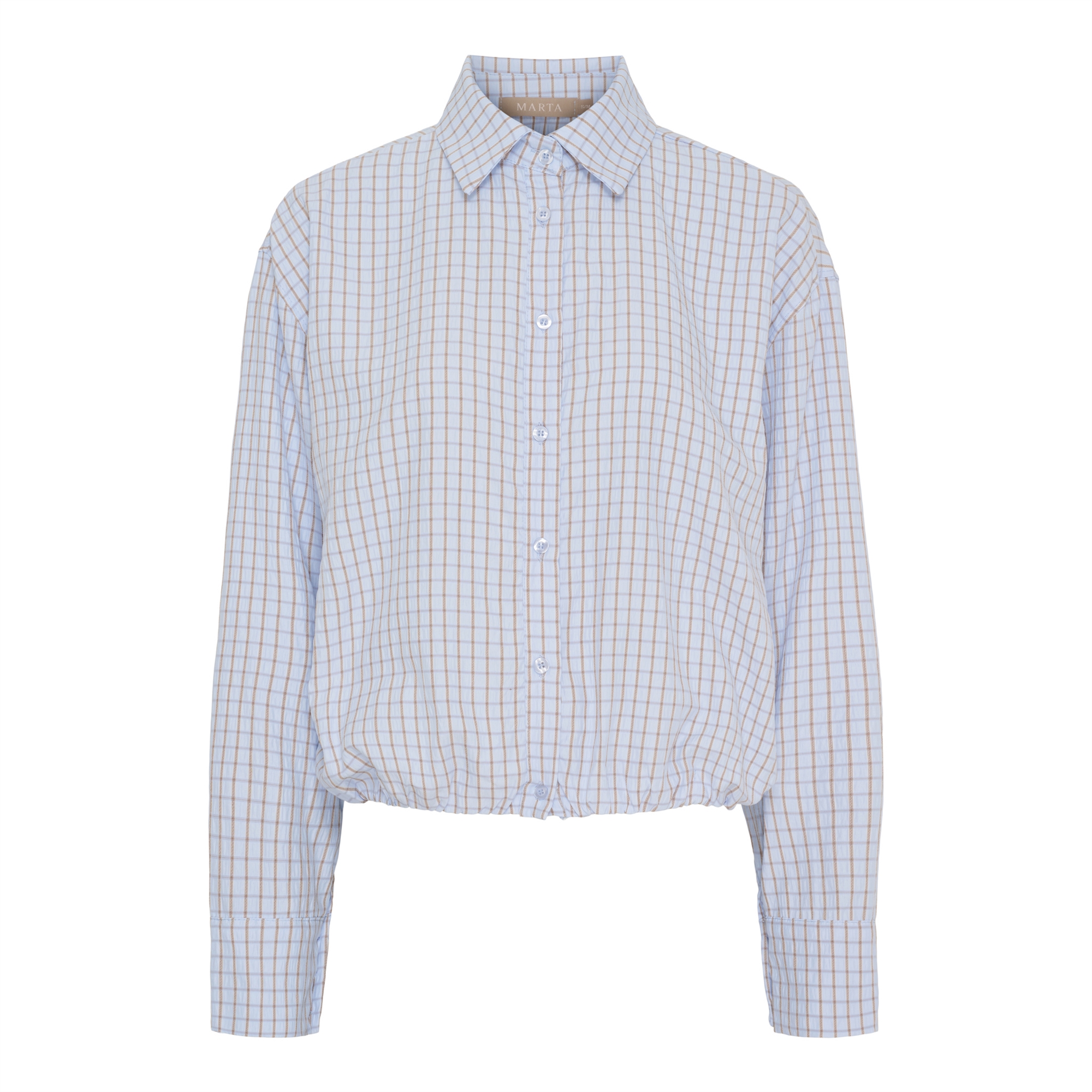 Lyseblå bluse med tynd brun strib i tern. Gennemknappet og med elastik forneden, dejlig tynd kvalitet.