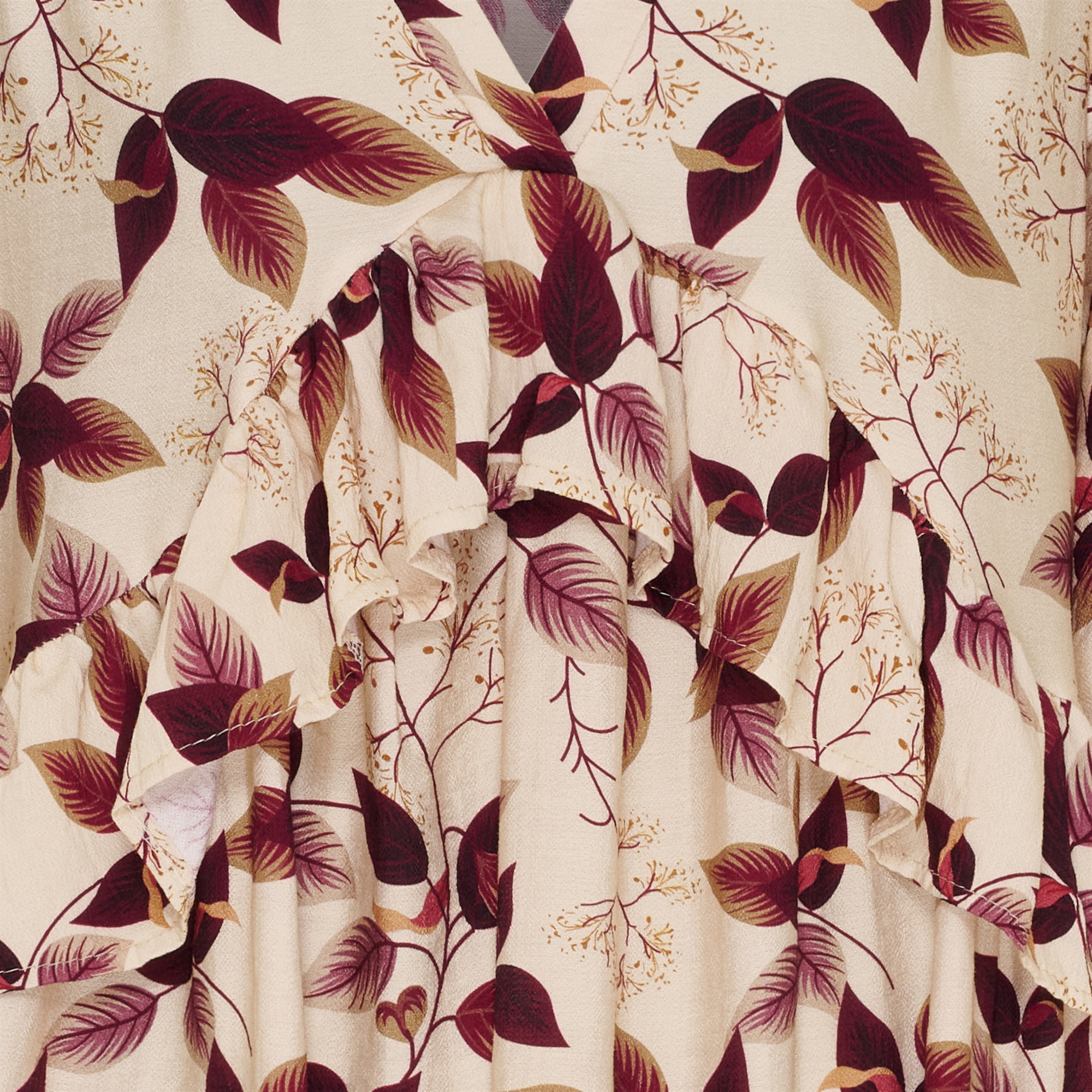 Fine bordeaux blade på denne skønne kjole, lange ærmer der afsluttes med en flæse.