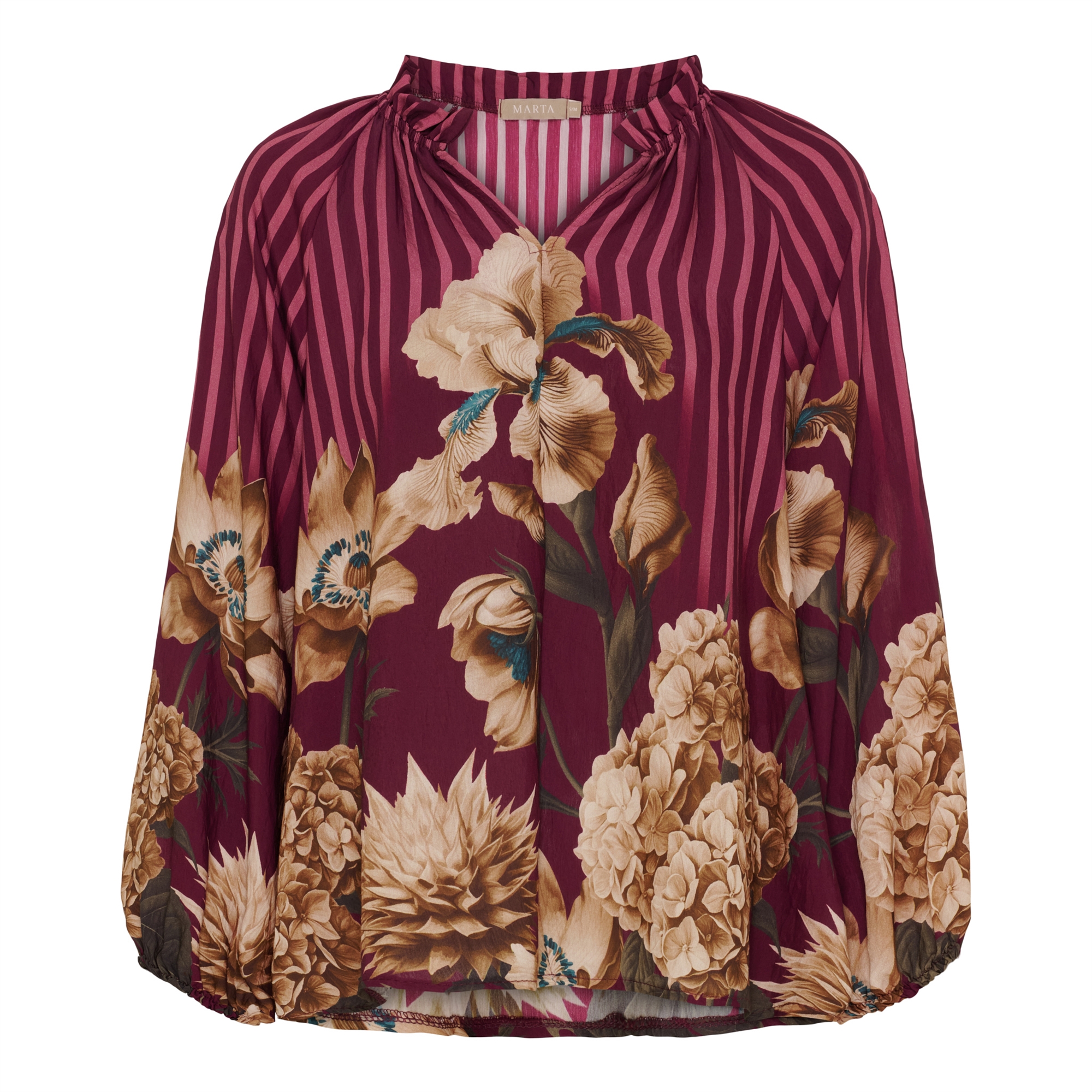 Super smuk Marta Du Chateau Octavia bluse i bordeaux med striber og flotte blomster i beige.