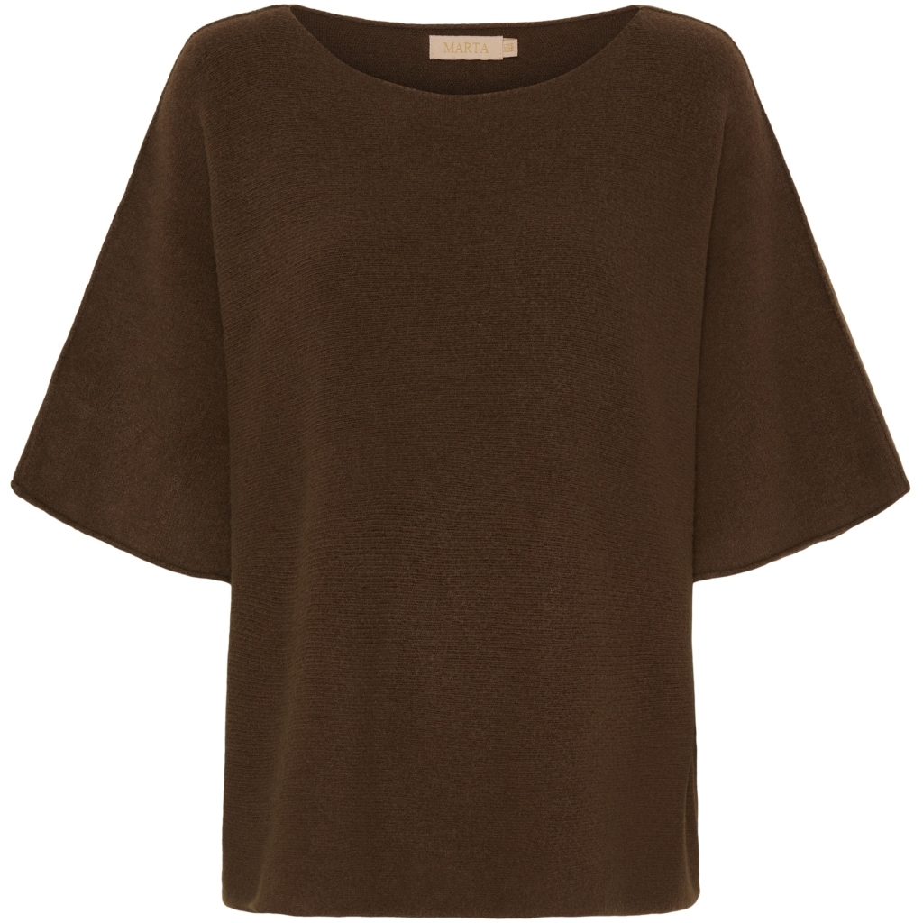 Skøn Marta Du Chateau Sia strik med korte ærmer og rund hals. Lækker blød og helt fantastisk med en af vores langærmede t shirts under. Flot mørkebrun. One size og god rummelig.