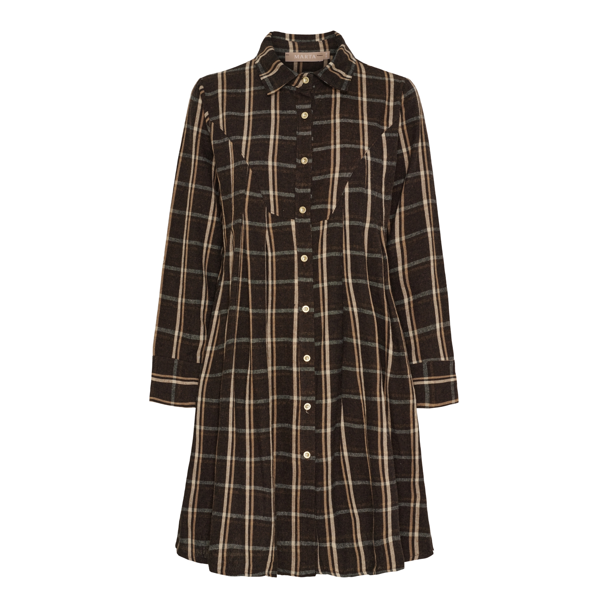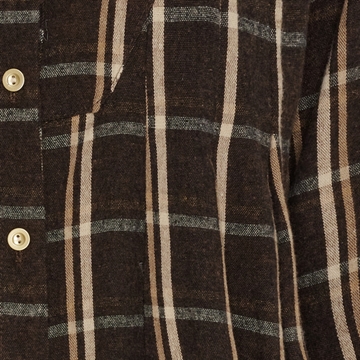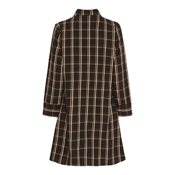 Gennemknappet kjole med klassisk skjortekrave. Brune tern med en smal beige strib.