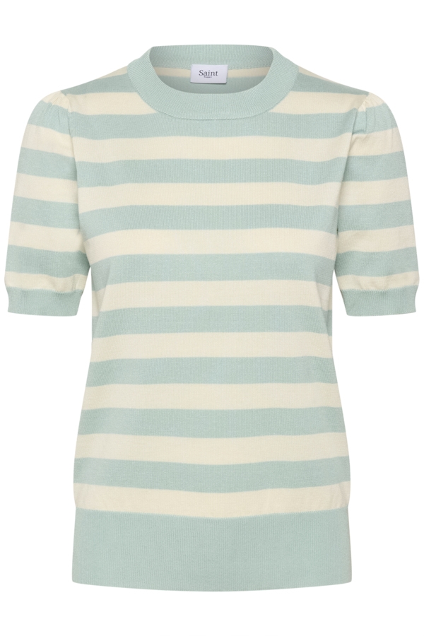 Skøn Saint Tropez Mila strik t shirt, med korte ærmer. Brede striber i lys grøn og creme, dejlig kvalitet og lidt puf ved skulder. Pink og rosa striber.