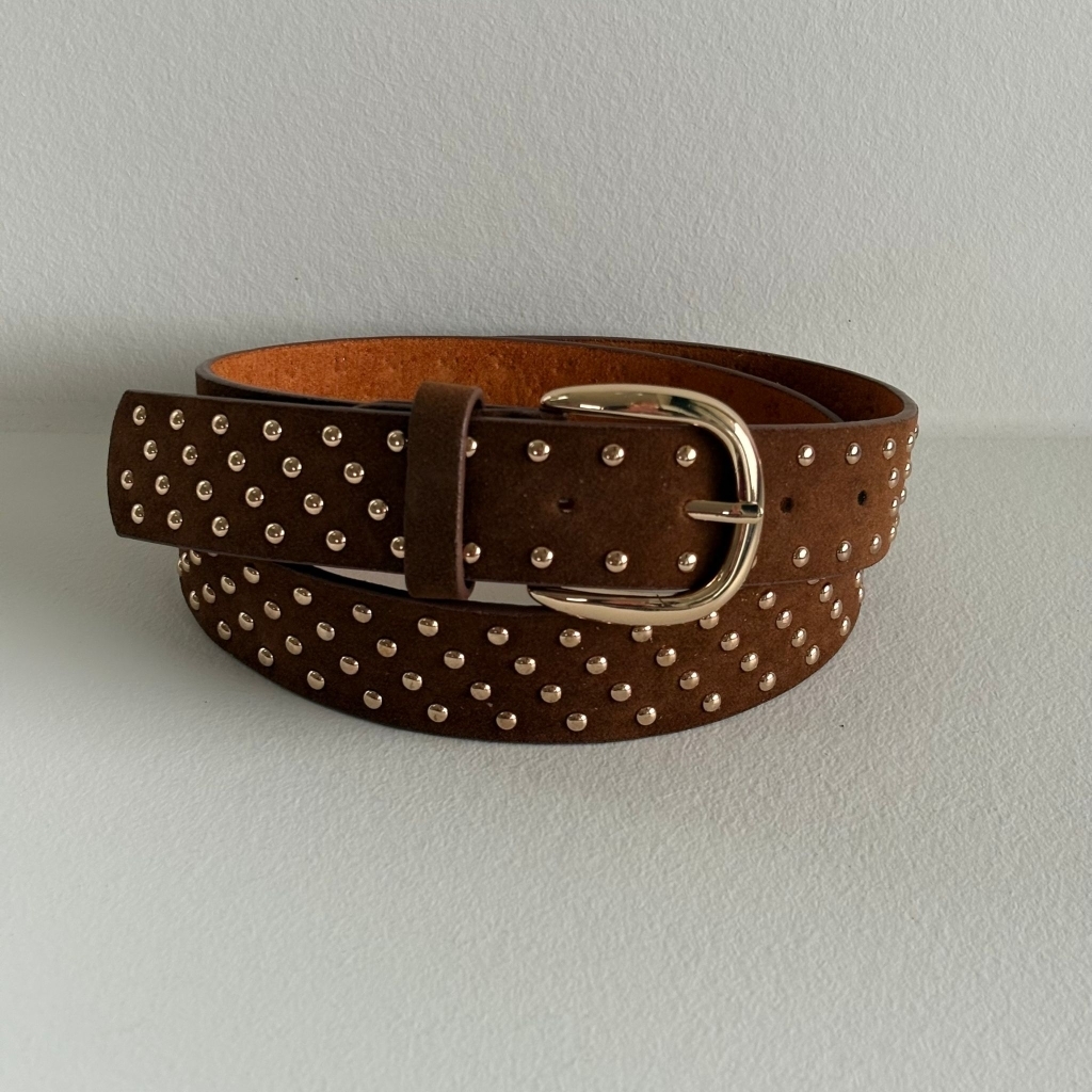 Lækkert Three M bælte i brun, med guld nitter.